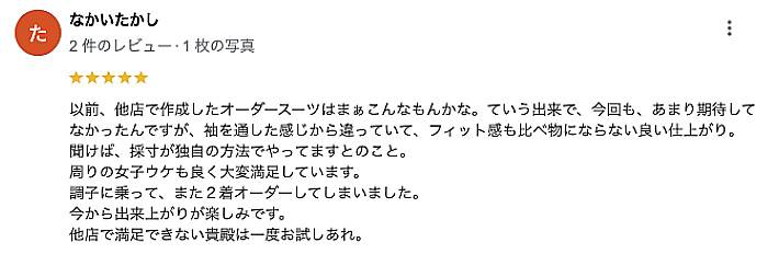 ゼロから型紙を起こすフルオーダーでも、廉価な有り型を利用するパターンオーダーでも、どんな有名な高級ブランドでも、何でも良いんですが、出来上がりが格好良くないと、意味がない。価値がない。と思います。 お客様がスーツを着用されて、ご自身で出来上がりに満足することもありますが、最終的にはその周りの方からの評価を受けて満足されるものだと思い、お客様の一着一着を、格好良く仕立てる事を第一として、常に新しい事に挑戦する意識を持っております。 装いやファッションは、本来はもっともっと楽しい事と同時に、個人個人が成果を出すために重要な要素の一つであります。人々の生活をより豊かに充実させる為に、装う事を決して簡単にあきらめてはいけません。装いやファッションが、今失いかけてる楽しさや、本来持っているチカラを取り戻し証明する。つまり自身の信念を持って装う、本当に格好良い大人を一人でも多くここに呼び戻す。 「日本人男性の装いを変えた男」が私の最終的な夢です。