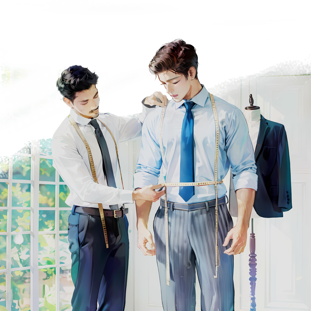 プロのフィッターが細部にわたり採寸します。あなたの体型に完璧にフィットするスーツを作るために、肩幅、ウエスト、袖丈などを正確に測ります。